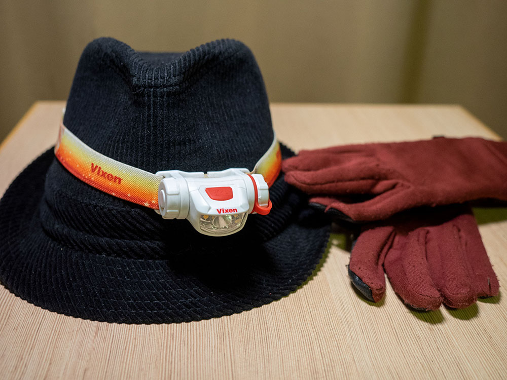 夜に行う星の撮影では、ヘッドライトなどの照明が必要。当日使っていたヘッドライトは、天体望遠鏡メーカー「ビクセン(Vixen)」の「天体観測用ライト SG-L01」。ライトの明るさや色をチューニングして、天体観測時に目がくらまないように配慮した製品とのこと。ほかにも、冬場なら手袋や帽子などはぜひとも用意しておきたいところです
