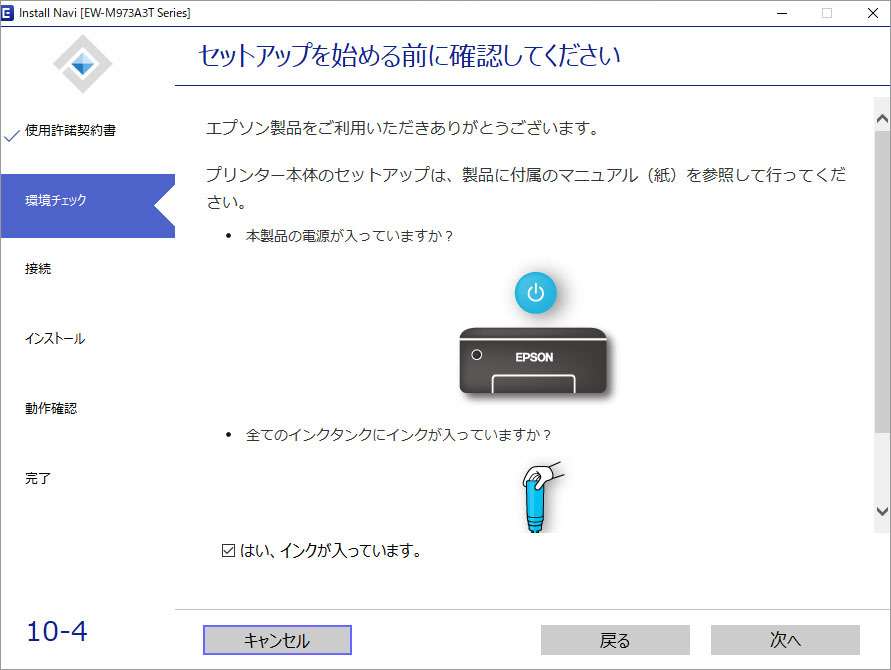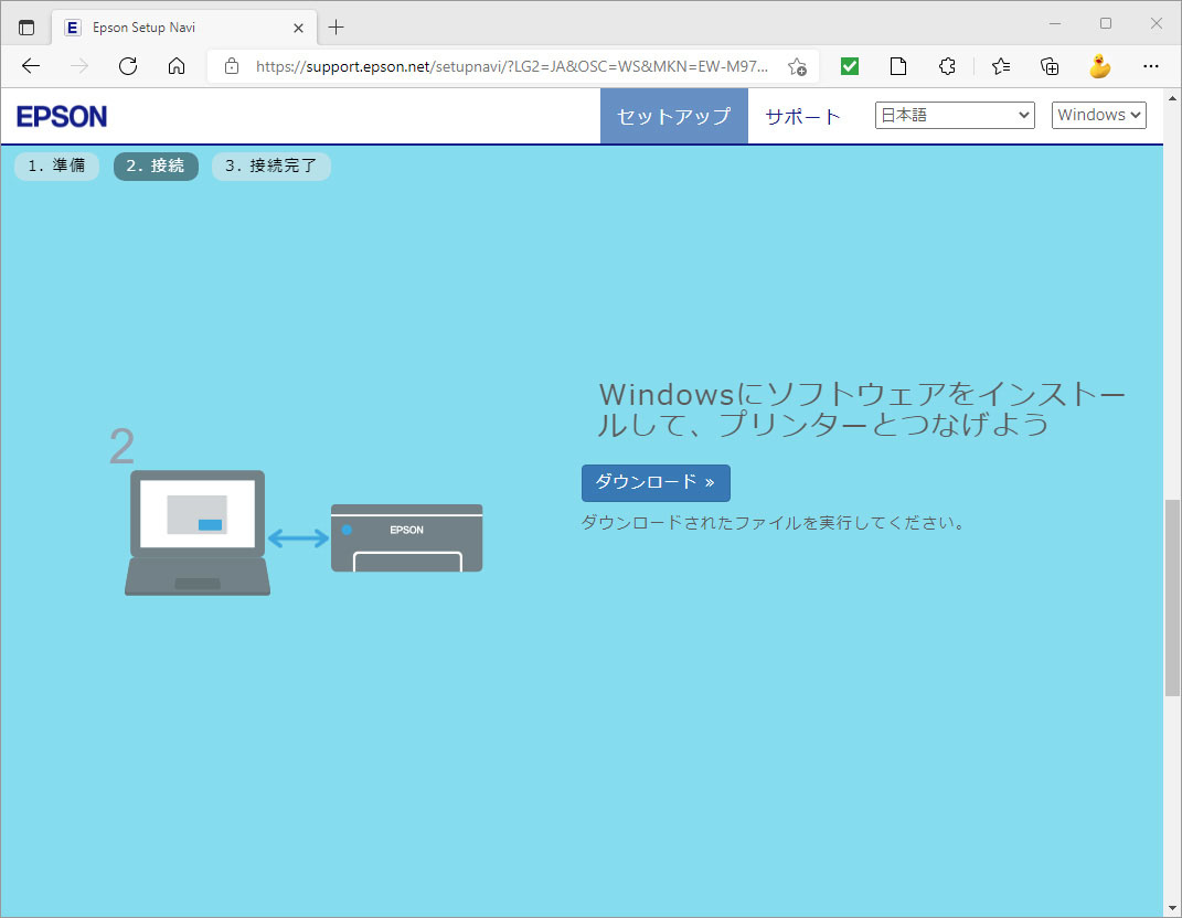 電源やインクに関する説明が終了したら、セットアップ用のソフトをダウンロードする。