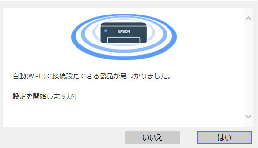 PCとプリンターの接続の設定画面。上の画面が表示されれば「はい」を選ぶだけでPCとプリンターはWi-Fi®で自動で接続される。下の画面が表示された場合は、Wi-Fi®/有線LAN/USBのいずれかの接続を選んだ後、指示に従って操作を行う。