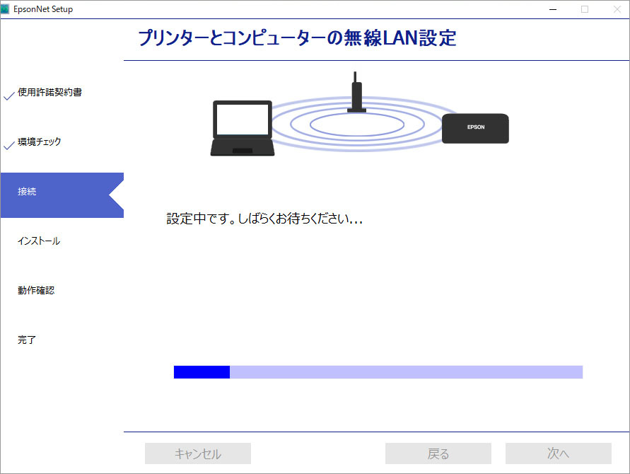 接続設定の進行中の画面。画面が変わるまでしばらく待つ。
