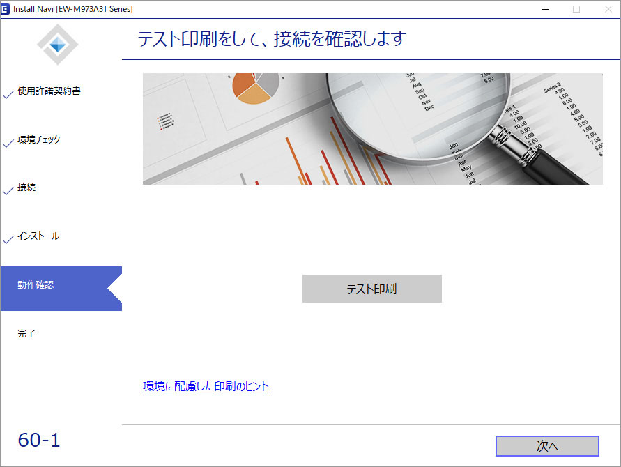 ドライバーやソフトのインストールが終わると、テスト印刷の画面に変わる。プリンターに用紙をセットし、「テスト印刷」ボタンを押して正常にプリントされるか確認をする。