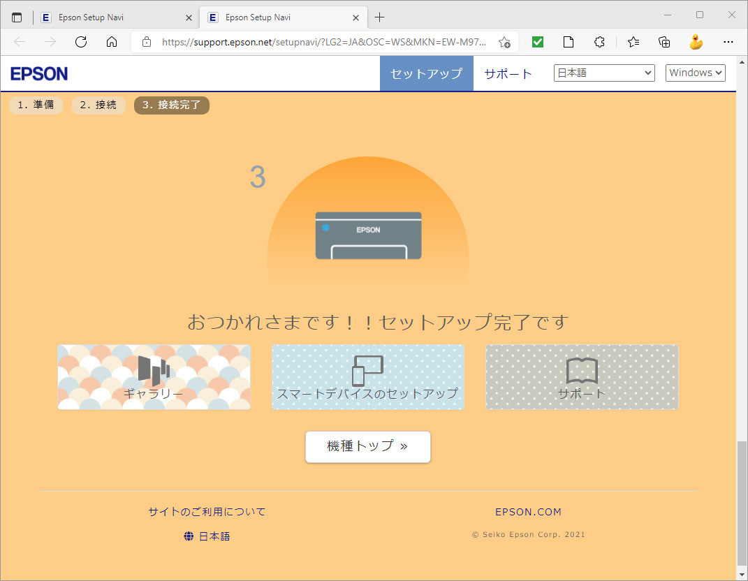 インターネットの「Setup Navi」にアクセス。機種を選んだ後、電源やインクの入れ方を確認する(一部動画もあり)。これらの解説はスキップすることも可能。