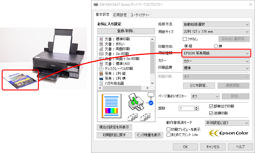 プリンターにセットしている用紙の種類とPC側の設定を間違えないことが、まずは第一です。その上で色補正(カラー調整)の設定をしますが、はじめはプリンターまかせの自動色補正(オートフォトファイン!EX)を使うのが簡単です。