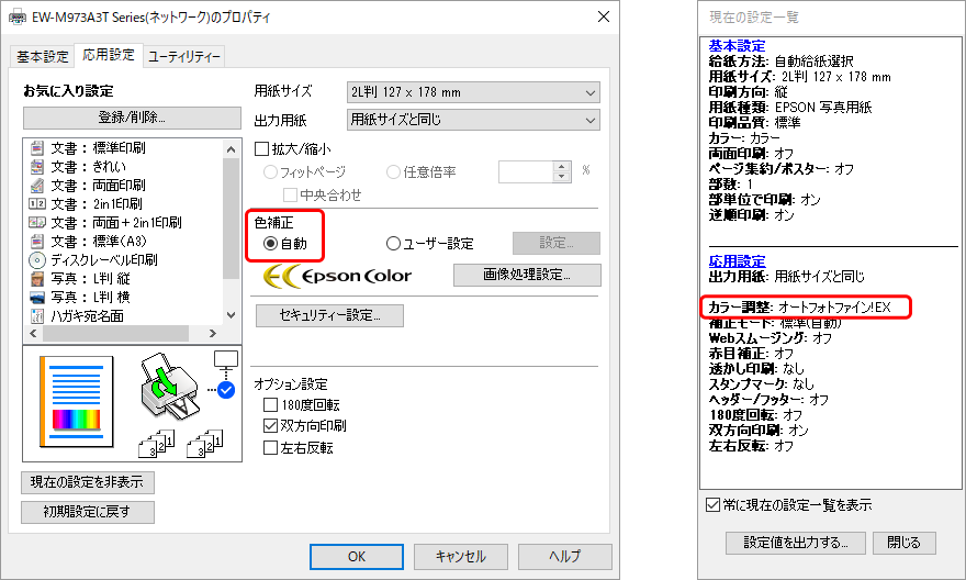 Windows®の場合、プリンタードライバーの「応用設定」タブにある「色補正」欄で「自動」を選ぶと「オートフォトファイン!EX」になる。また「ユーザー設定」ボタンを押して、手動で「オートフォトファイン!EX」を選ぶこともできる。Windows®のバージョンやアプリケーションの種類によってプリンタードライバーの画面が多少変わることがあるが、設定内容は同じだ。なお、現在どのような設定になっているかは「現在の設定一覧」画面で確認できる(右図)。