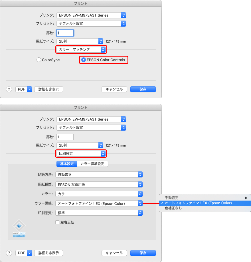 プリンタードライバーを開いたら、まず「カラーマッチング」を選んで「EPSON Color Controls」を選ぶ(上図)。次に「印刷設定」を選び、「カラー調整」で「オートフォトファイン!EX(Epson Color)」を選ぶ。