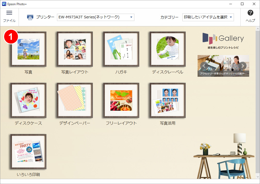 1「Epson Photo+」を起動したら「写真」を選びます。「写真」は、1枚の用紙に1枚の写真をプリントします。