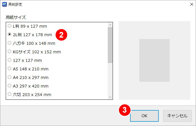 2「用紙設定」の画面に変わるので、プリントしたい用紙サイズを選びます。図では「2L判」を選んでいます。