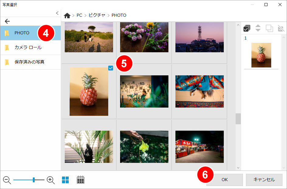 5次に写真を選びます。選ばれた写真には「✓」マークが付きます。複数の写真を選ぶことも可能です。