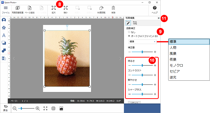 10さらに必要に応じて「明るさ」「コントラスト」「鮮やかさ」「シャープネス」の調整も可能です。