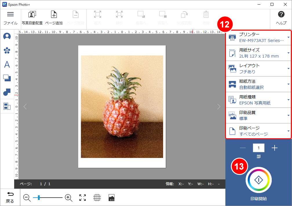 12右の欄で、「プリンター」「用紙サイズ」「レイアウト(フチあり/フチなし)」「給紙方法」「用紙種類」「印刷品質」「印刷ページ」の各項目を確認、設定します。