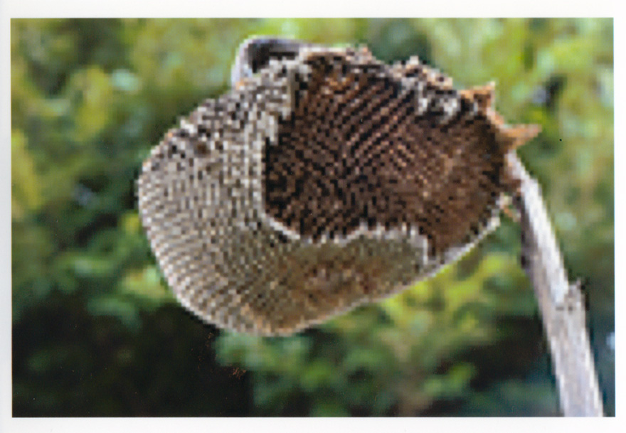 ところで、プリントの場合に気をつけなければならないことは、プリントするサイズによって精細感が変わってくるということです。同じ写真データを小さくプリントした場合と、大きくプリントした場合とで比べるとどうなるでしょうか? もともとの画素数は同じですから、小さくプリントすると画素がギュッと詰まった密度の高い精細なプリントになります。一方、大きくプリントすると画素が間延びした粗いプリントになります。