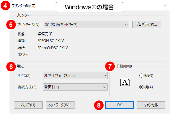 17「用紙種類」で「光沢」か「マット」かを選びます。ここでは「写真用紙<絹目調>」を使うので「光沢」としています。