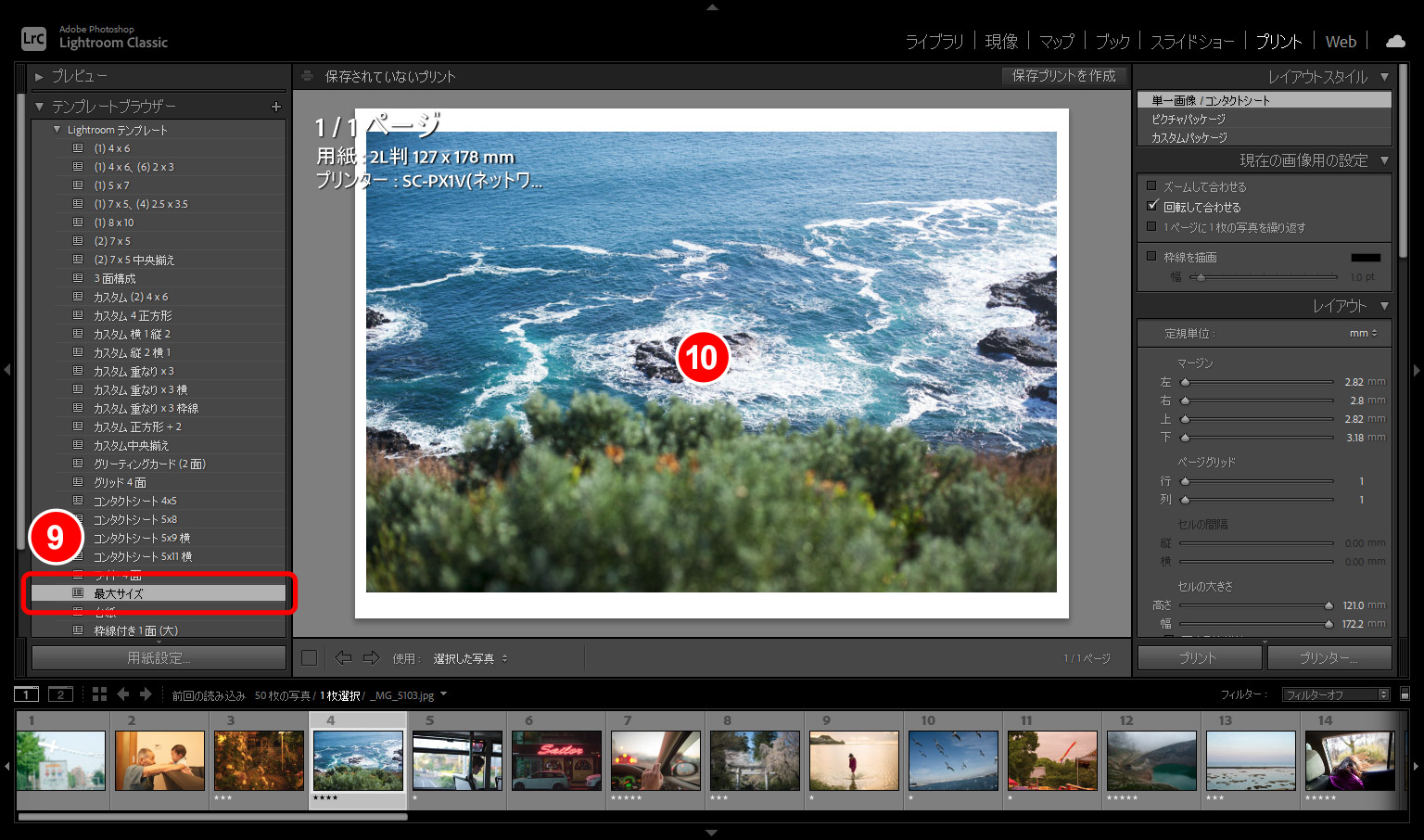 9Adobe® Photoshop® Lightroom® Classicに戻ります。左側の「テンプレート」パネルの「Lightroom テンプレート」から今回は「最大サイズ」を選びます。