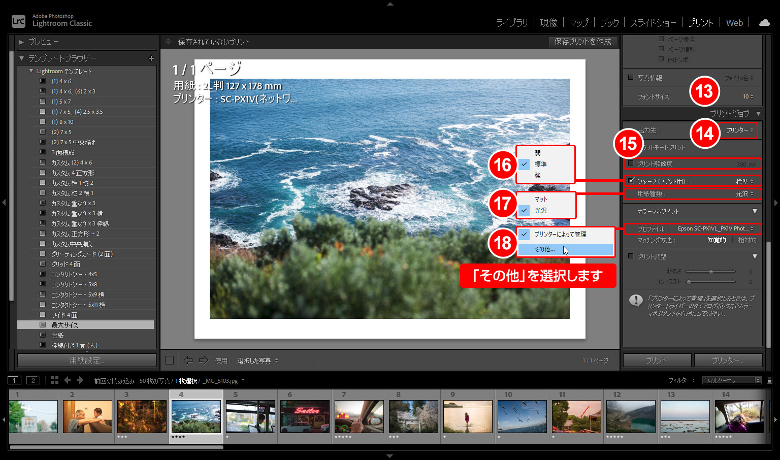 16「シャープ(プリント用)」でシャープの強さを選びます。図では「標準」を選んでいます。このシャープ設定はプリント時に処理されるだけで、元画像には影響を与えません。