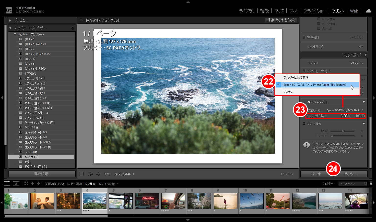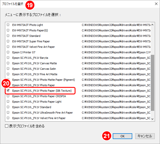 20プリントしたい用紙のプリンタープロファイルを選びます。プリンタープロファイルの名称は、前半がプリンターの機種、後半が用紙の種類となっています。ここでは、SC-PX1Vで「写真用紙<絹目調>」にプリントするため、それに該当する「Epson SC-PX1VL_PX1V Photo Paper(Silk Texture)」にチェックを入れています。