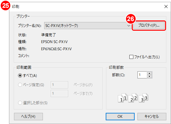 33「OK」をクリックすると、[25]の「印刷」画面に戻るのでそこでも「OK」をクリックしてプリントを実行します。