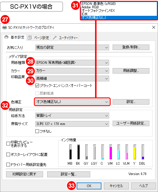 31「色補正」を「オフ(色補正なし)」とします。これは、[22]でプリンタープロファイルを選んでおり、それによってプリンターの機種と用紙に最適化された色補正がなされるためです。ここで「オフ(色補正なし)」以外を選ぶと過剰な色補正がなされ、良好な色味のプリントが得られません。