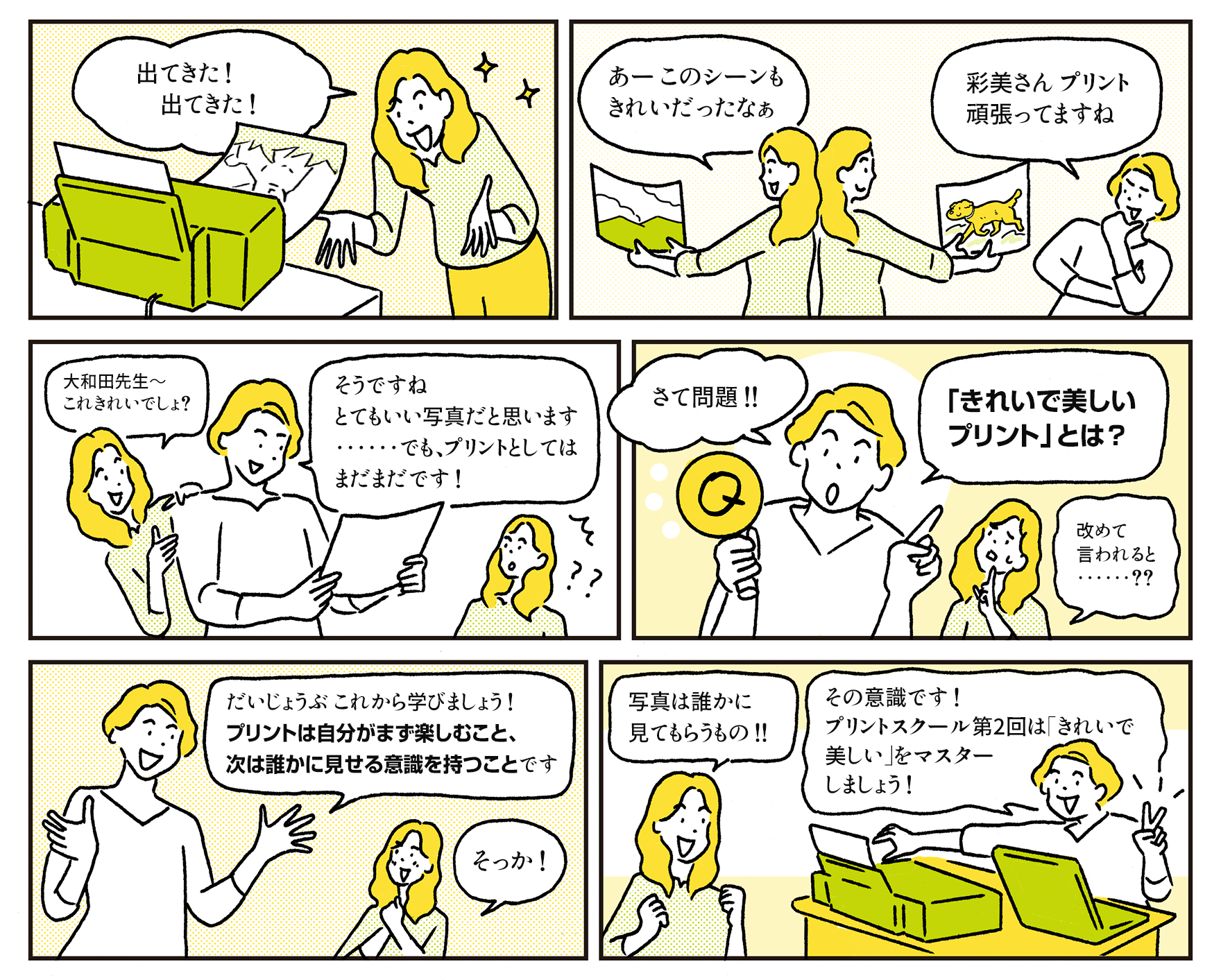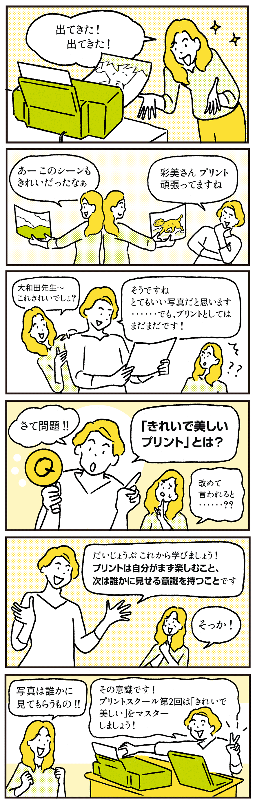 きれいなプリントを目指す彩美さんは写真データでトラブルに!? 次回も大和田先生がプリントのためのデータの基礎をやさしく教えてくれます。お楽しみに!
