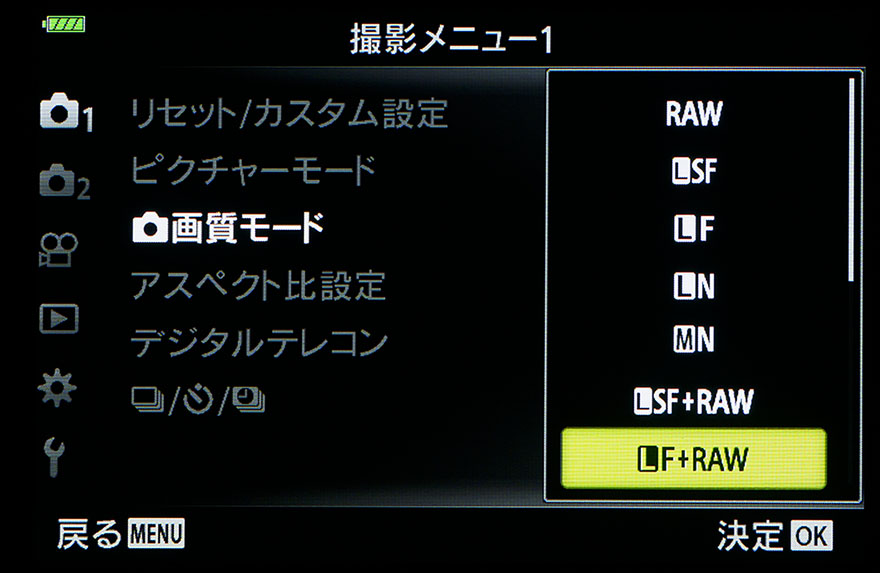 写真はオリンパス(OMデジタルソリューションズ)のデジタルカメラでRAWとJPEGの同時記録を選んでいるところ。