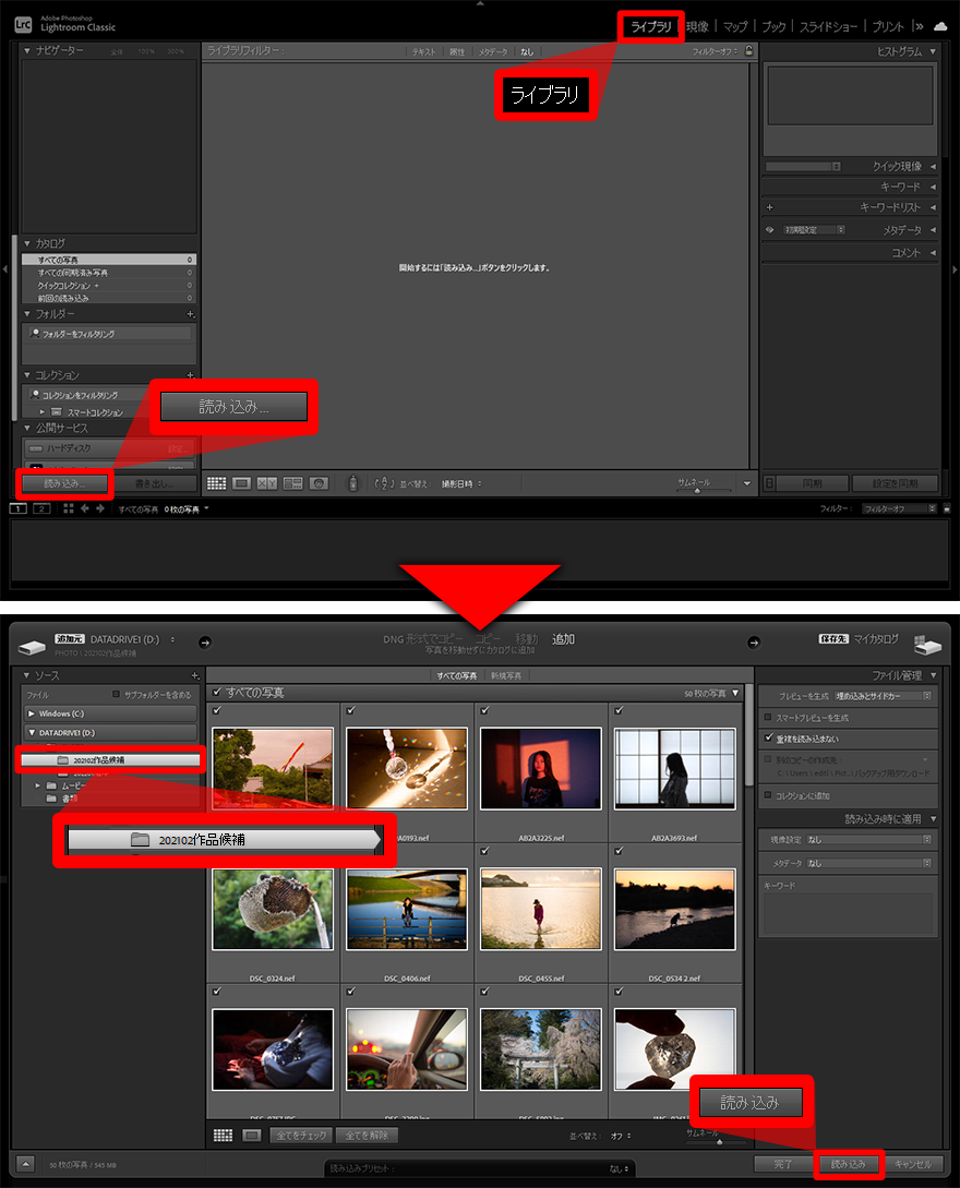 Lightroom® Classicでは、あらかじめ写真を読み込む必要がある。「ライブラリ」モジュールの「読み込み」ボタンをクリックし(図上)、読み込み画面が開いたら写真データを保存しているフォルダを選んで写真を確認し、読み込みを実行する(図下)。