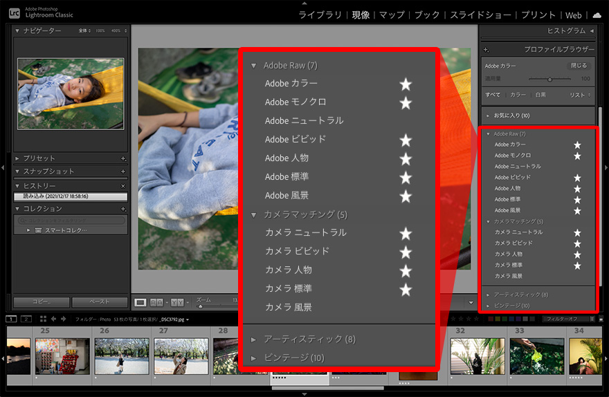 作品にしたい写真を選んだら、「現像」モジュールに切り替えます。ここで本格的なRAW現像調整を行う前に、確認しておくことがあります。1つは「プロファイル」の選択です。デジタルカメラの設定で「スタンダード」や「ビビッド」「風景」などの仕上がり設定を選べるようにLightroom® Classicでもアドビ独自の仕上がりやカメラメーカーの仕上がりを模した設定が用意されています。それがプロファイルです。RAW現像の土台となるものなので、現像前に選んでおきましょう。
