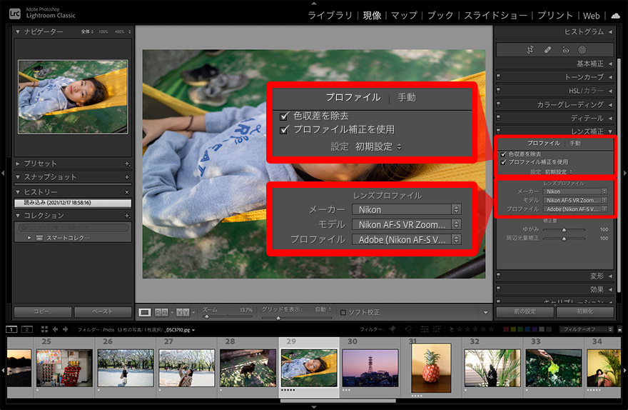 レンズ補正の適用