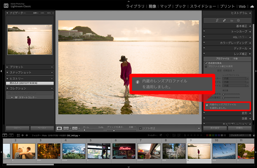 「レンズ補正」パネルの「プロファイル」では、色にじみを軽減する「色収差を除去」と、周辺光量や歪曲収差を補正する「プロファイル補正を使用」の2つを適用できる(図上)。「プロファイル補正を使用」にチェックを入れると「レンズプロファイル」に「メーカー」「モデル(レンズの種類)」「プロファイル(補正データ)」が適用される。変更することも可能だが、基本的にはそのままでいい。「色収差を除去」と「プロフィル補正を使用」については、作品をどのように仕上げたいかによって、適用の有無を判断しよう。また、カメラやレンズの種類によってはレンズプロファイルが自動で適用され、その場合は「内蔵のレンズプロファイルを適用しました」というコメントが表示される(図下)。なお「手動」タブでは各補正の強さや効果を手動で調整できる。