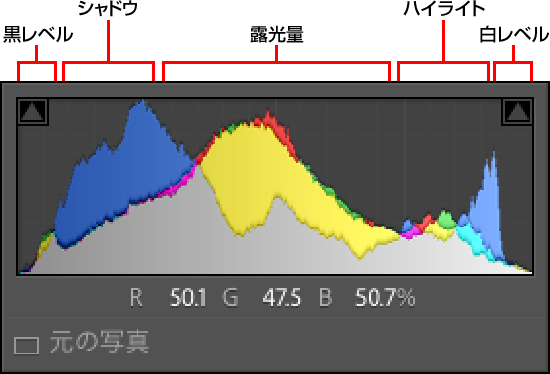 「露光量」「ハイライト」「シャドウ」「白レベル」「黒レベル」は、ヒストグラム上では図に示した階調範囲を中心に調整する。