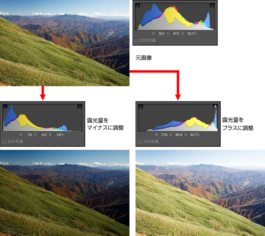 中間調を中心に、写真全体の明るさを調整する。撮影後に行える露出補正のようなイメージだ。ヒストグラムの変化を確認すると中間調付近が左右にずれているのがわかる。作例は「露光量」の値をマイナス側とプラス側に調整したもの。
