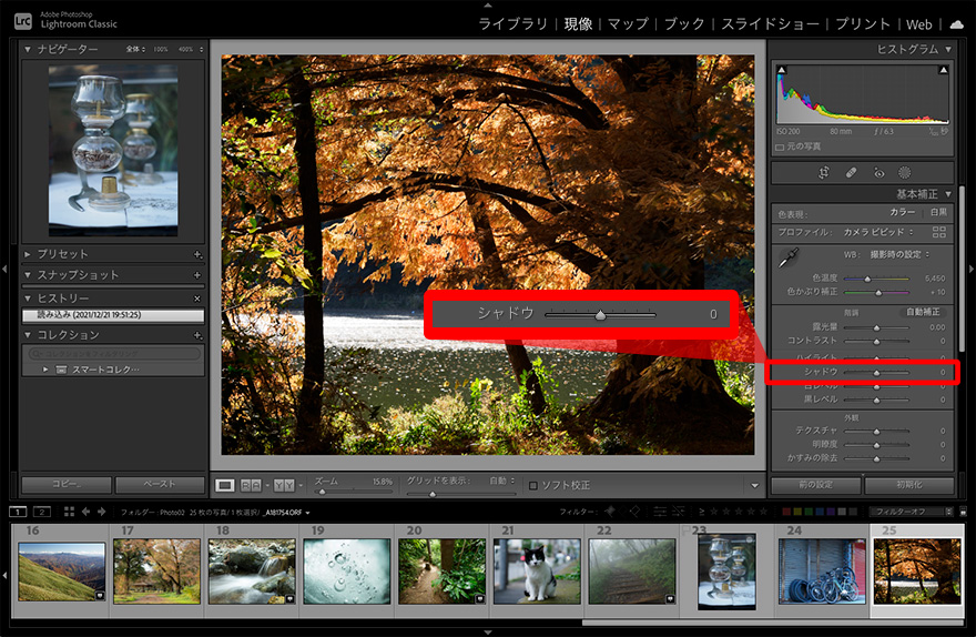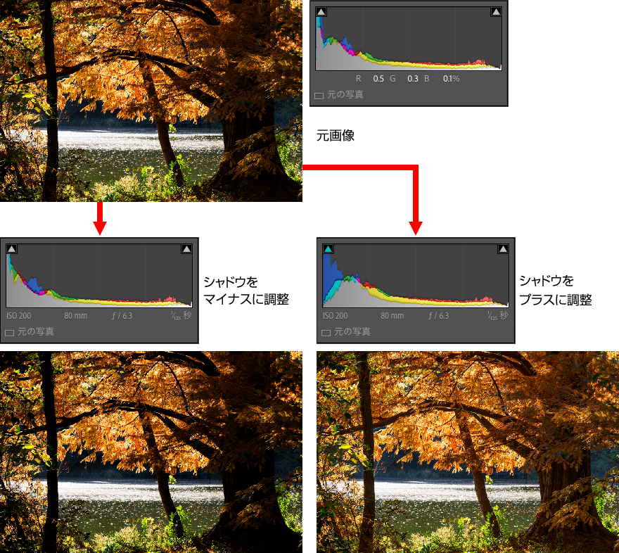 中間調より暗い部分の明るさを調整する。プラスに調整して暗く沈みがちな部分を明るくし暗部のディテールを見せたり、逆に締まりのない写真ではマイナスに調整することで暗部を引き締めることができる。ヒストグラムは中間よりやや左側の変化が大きい。作例は「シャドウ」の値をマイナス側とプラス側に調整したもの。