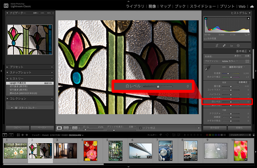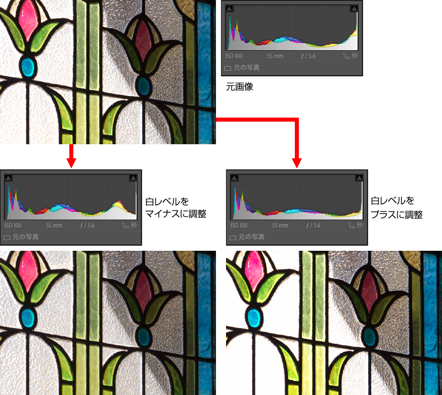 最も明るい階調範囲を中心に明るさを調整する。白飛びしている場合はマイナス側に調整すると多少トーンが回復することがある。ハイライト不足で抜けの悪い写真はプラスに調整すると抜けがよくなる。ヒストグラムの変化は右端部分が中心となる。作例は「白レベル」の値をマイナス側とプラス側に調整したもの。