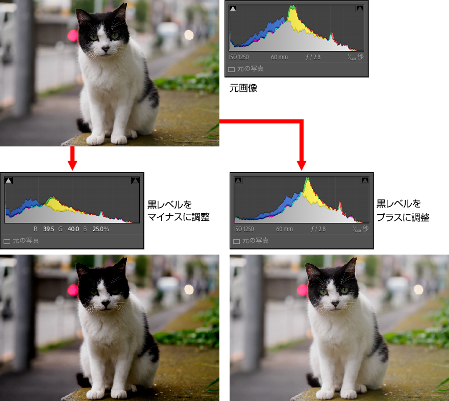 最も暗い階調範囲を中心に明るさを調整する。プラスに調整して黒つぶれを回避したり、逆にマイナスに調整して黒を締めることができる。ヒストグラムの変化は左端部分が中心となる。作例は「黒レベル」の値をマイナス側とプラス側に調整したもの。