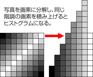 図の左側は、黒から白までのグラデーションを8階調(64画素)で示したものです。階調ごとに画素の数を数えると最も黒い画素が2つ、それよりわずかに明るい画素が4つ、その次が6つ、次が8つ、さらに10、12、14となり、最も明るい画素では8つとなります。この画像をいったん画素にバラして、階調ごとに積み上げます。すると、階調ごとの画素数の分布がわかります。これがヒストグラムというわけです。ここでは簡単な図で示しましたが、実際には数千万という画素の情報から写真のヒストグラムが表示されています。