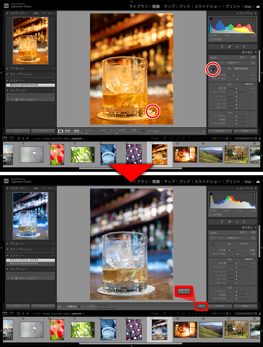 スポイトの形をした「ホワイトバランス選択ツール」を選んで、もともとが白やグレーの無彩色である部分をクリックする(図上)。すると瞬時に自然な色合いに調整してくれる。希望通りの色合いにならない場合は別の場所でもクリックしてみよう。[完了]ボタンを押して終了する(図下)。その後、必要に応じて「色温度」や「色かぶり補正」で微調整をする。
