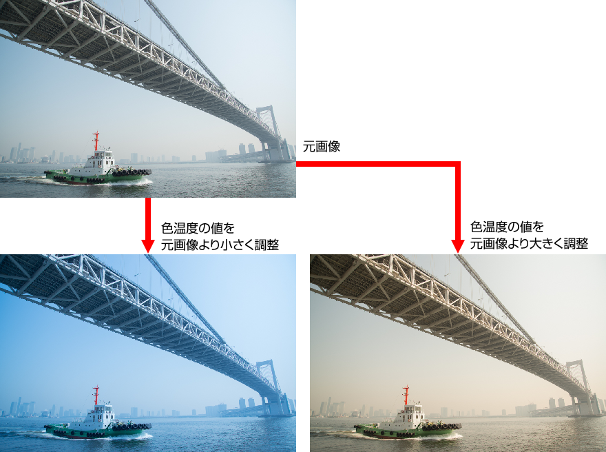 スライダーを左にずらす(値が小さくなる方向)と青かぶりが強まり、スライダーを右にずらす(値が大きくなる方向)と黄赤かぶりが強まる。青かぶりした写真に対してはスライダーを右に、黄赤かぶりをした写真に対してはスライダーを左にずらすと自然な色合いになる。作例は元画像の「色温度」の値が「5050」であったのに対してそれよりも値を小さくしたものと値を大きくしたもの。