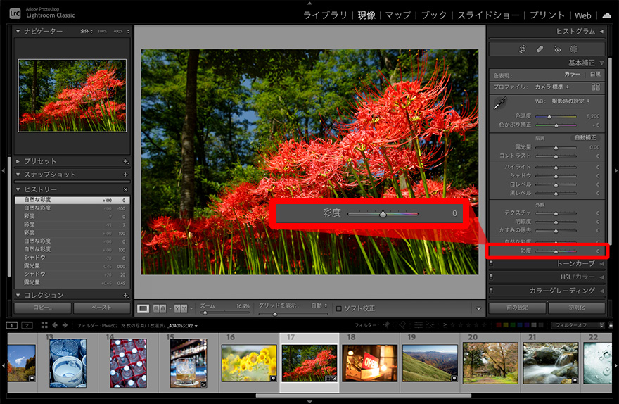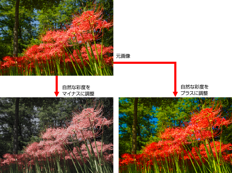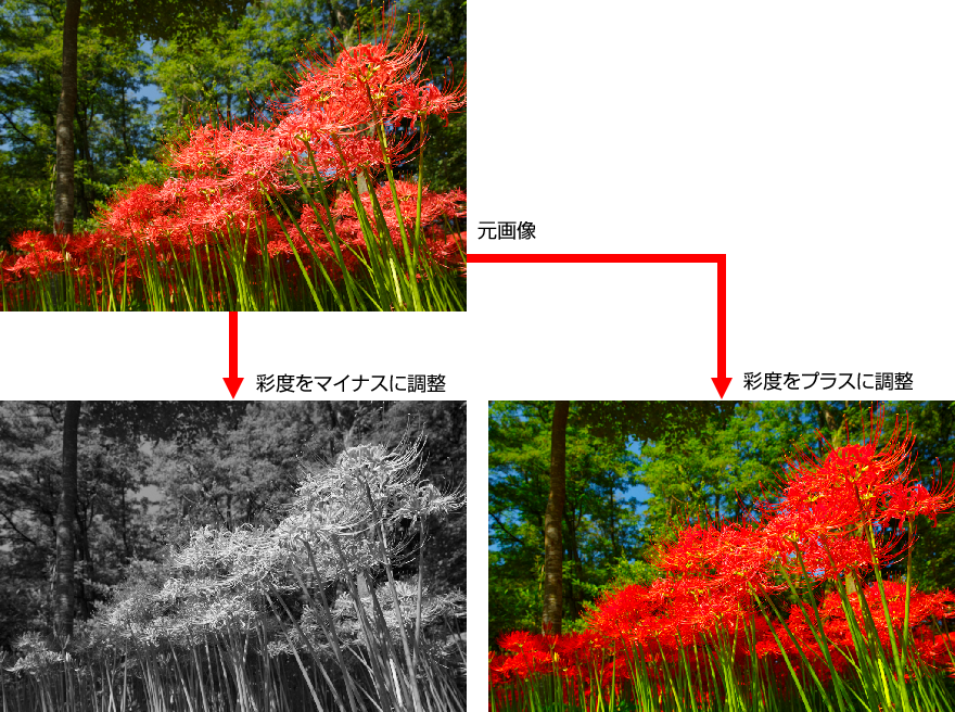 スライダーを左にずらす(値がマイナスになる方向)と彩度が弱まり、−100まで調整すると白黒の状態になる。スライダーを右にずらす(値がプラスになる方向)と均一に彩度が高まるが、調整しすぎると色が強調されすぎて不自然に見えるので注意する。作例は「彩度」の値をマイナス側とプラス側に調整したもの。もともと彩度の低い空の青はあまり色みが強まらないが、もともと彩度の高い曼珠沙華の赤は色飽和に近い状態になった。