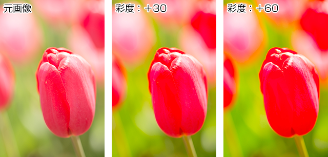 色飽和とは、彩度が上がりすぎて色の階調がなくなった状態のこと。色飽和した部分は絵の具をべったりと塗ったようで立体感が乏しくなる。意図的に色飽和を表現に取り込むならいいが、階調を重視する写真表現において色飽和はあまり好まれない。上の作例では、左から元画像、中央と右は「彩度」の値を「+30」「+60」と変化させている。彩度が上がるにつれ色飽和が進み、チューリップの花びらの質感が失われていくのがわかる。彩度の上げすぎには注意が必要だ。