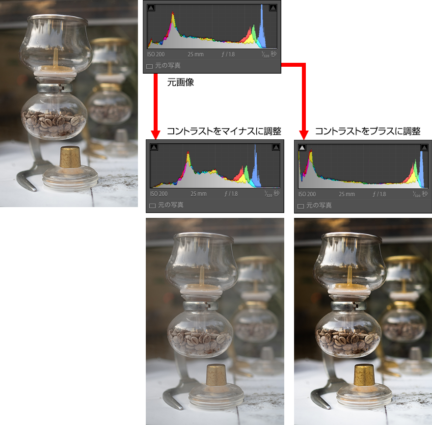スライダーを左にずらす(値がマイナスになる方向)とコントラストが低下し、写真はやわらかな印象になる。スライダーを右にずらす(値がプラスになる方向)とコントラストが高くなり、写真はクッキリと見えるようになるが、調整しすぎると白飛びや黒つぶれが生じやすくなる。作例では「コントラスト」の値をマイナス側とプラス側に調整している。プラス側に調整した写真では、コントラストを強めたために黒潰れや白飛びが起きかけている。
