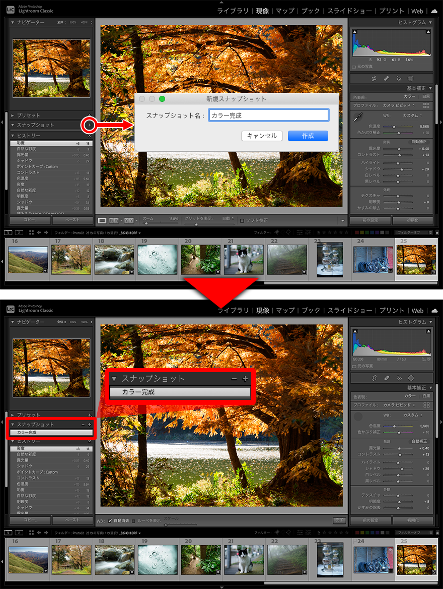 RAW現像が終わったら、「スナップショット」パネルの[+]ボタンをクリックし、「新規スナップショット」の画面で名前を入力して「作成」ボタンを押す(図上)。すると、その名前のリストが「スナップショット」に表示される(図下)。調整項目のスライダーを操作するなどして写真が変化した場合、「スナップショット」パネルでそのリストをクリックすれば、スナップショット記録時の状態に戻してくれる。