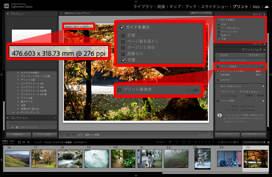 プリント時の画像の解像度の確認は「プリント」モジュールの「ガイド」パネルで「寸法」をチェックし、「プリントジョブ」パネルの「プリント解像度」のチェックを外すと、写真の左上にサイズとともに解像度を示す「ppi」が表示される。高画質と言われる解像度はA4サイズ程度までなら300ppi、A3ノビサイズ程度までなら240ppiが目安。この設定にすると、表示された解像度でプリントされる。図はA3ノビサイズでのプリントで、解像度は「276ppi」となっている。一方、「プリントジョブ」パネルの「プリント解像度」にチェックを入れ、解像度の値を指定した場合は、その解像度でのプリントとなる。