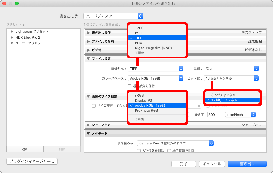 完成した作品をプリントするのではなく、ラボ等で出力したいとか完成データとして別ファイルで保存しておきたいという場合は、「書き出し」という機能を使ってファイルを書き出すことができます。その際、TIFFやJPEGといった「画像形式」や「ビット数」「色域」の指定が可能です。ここで「色域」について簡単に触れておきましょう。「sRGB」や「Adobe® RGB」といった言葉を聞いたことがあると思いますが、色域とはその写真データが表現できる色の範囲のことです。sRGBとAdobe® RGBで比べると、Adobe® RGBのほうが広い色域をカバーしています。一般的にはモニターで表示するならsRGB、プリントするならAdobe® RGBにすることが多いようです。ただし、Adobe® RGB対応のモニターでないとAdobe® RGBの写真を正確に表示することができないので注意してください。また、完成データの保存用としてなら、とても色域の広い「ProPhoto RGB」で保存するという選択肢もあります。どのような用途で利用するかによって、「画像形式」や「ビット数」「色域」を選んでください。