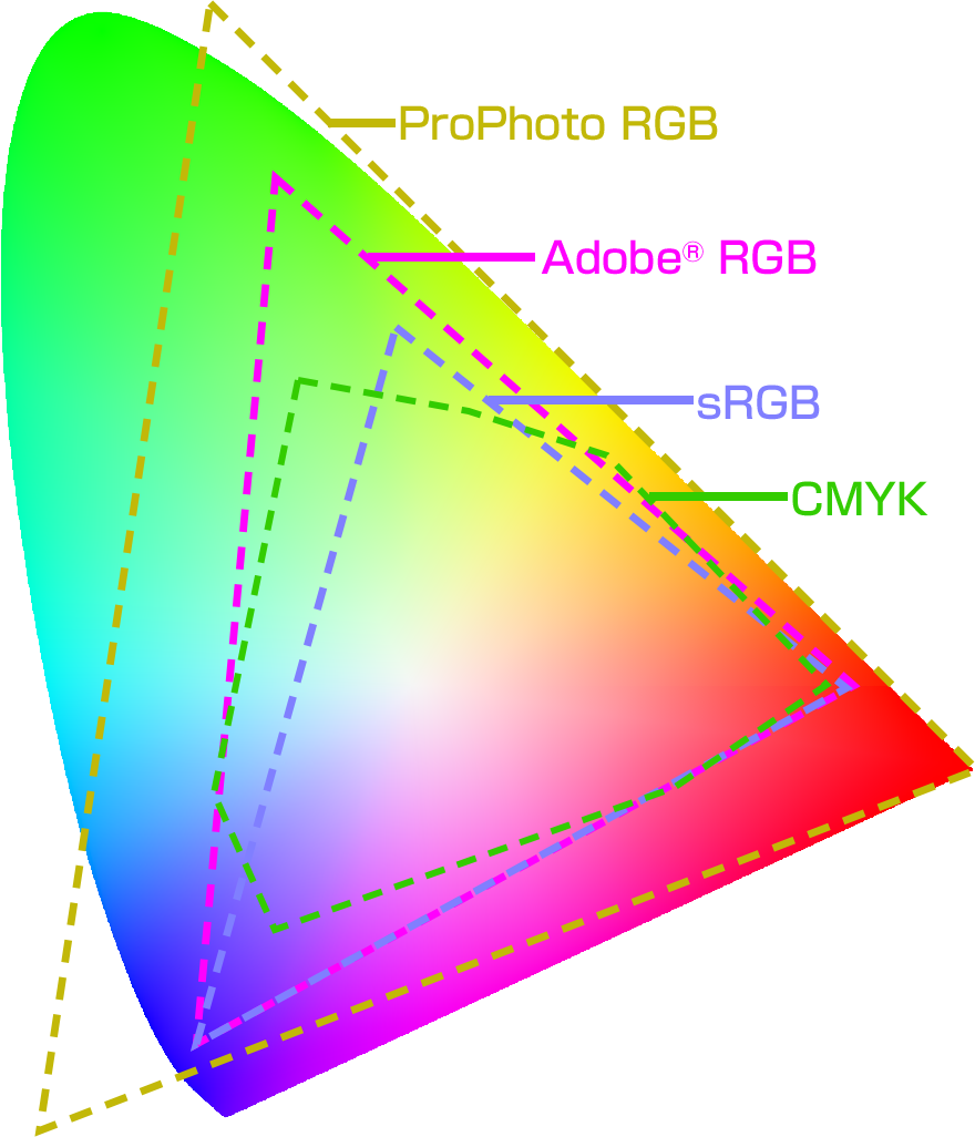 図はsRGBとAdobe® RGB、ProPhoto RGB、さらに一般的なCMYKの色域の違いを示している。色がついている馬蹄形の部分は人が知覚できる色の範囲。カバーする範囲が外側に広がるほど彩度の高い色を表現できるようになる。Adobe® RGBは特に緑やシアンの色域において、sRGBよりも1周りほど色域が広い。また、プリントで使われるCMYKの一般的な範囲は色域の形が複雑になり、Adobe® RGBよりも広い部分では、さらに高彩度の色を表現できる。