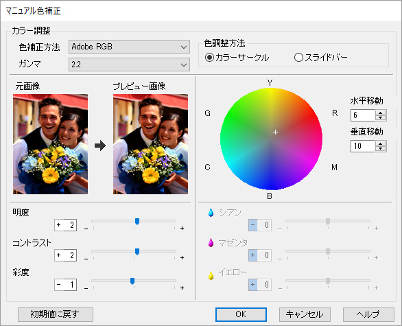 - モニター表示や画像処理ソフトに頼らず、実際のプリントから色や明るさを判断して調整する場合は、プリンタードライバーの「マニュアル色補正」を使います。ただし、この方法は一時的な対策なので、キャリブレーションされたモニターを使い、オリジナルの写真データをきちんと仕上げるのが理想です。