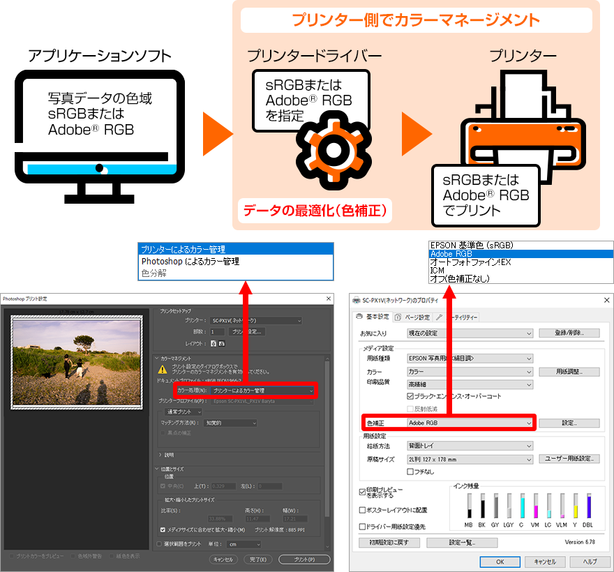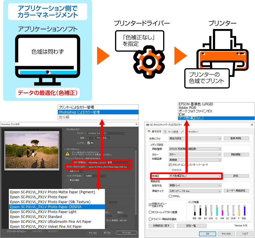 (注)図はAdobe® Photoshop®でカラーマネージメントを行ってプリントする例。プリンターはSC-PX1V。
