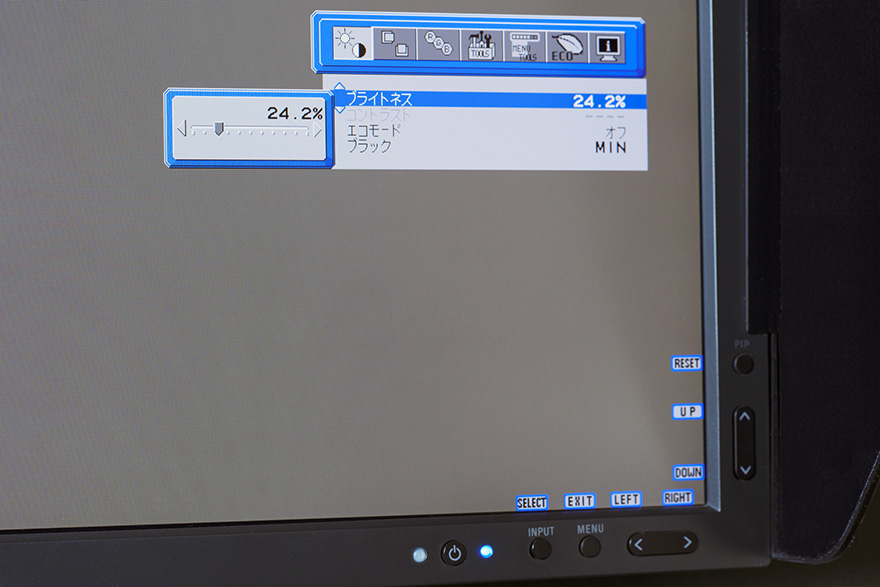 モニターに調整機能がある場合、明るさやコントラスト、色温度、色合いなど調整することができます。また、OSのキャリブレーション機能やセンサーを利用するキャリブレーションツールを使う場合も、モニター自体の調整機能を利用します。