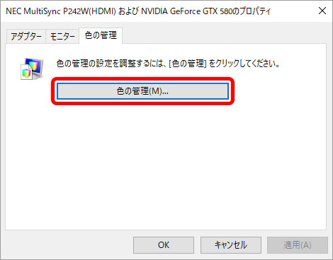 1モニターのプロパティを開き「色の管理」タブを選んで「色の管理」ボタンをクリックします。