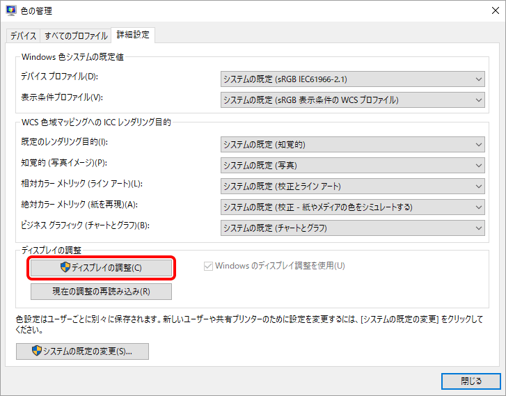 2「色の管理」画面が開いたら、「ディスプレイの調整」ボタンをクリックします。