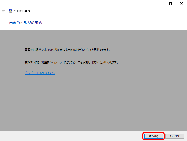 3「画面の色調整」画面に変わります。「次へ」をクリックします。