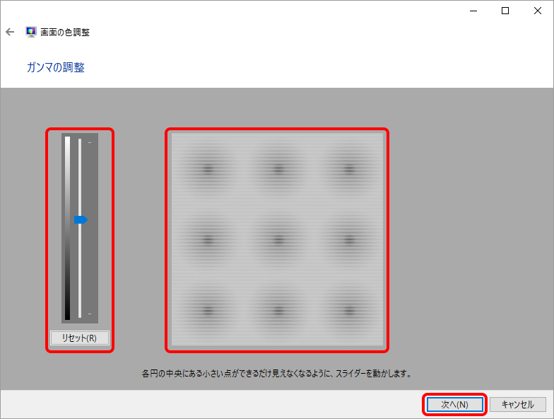 4いくつかの説明画面表示された後、「ガンマの調整」画面に変わります。左側の上下のスライダーを動かして、各円の中央にある丸い点が周囲に溶け込んでなるべく見えなくなるようにします。このとき点を凝視せず、目を薄目にしてぼんやりと見るようにすると、作業がしやすくなります。終わったら「次へ」をクリックします。