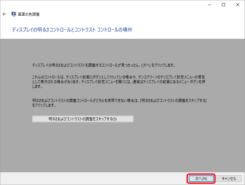 5続けて明るさとコントラストの調整を行いますが、モニター本体に調整機能がない場合は、この段階でスキップします。「次へ」をクリックします。